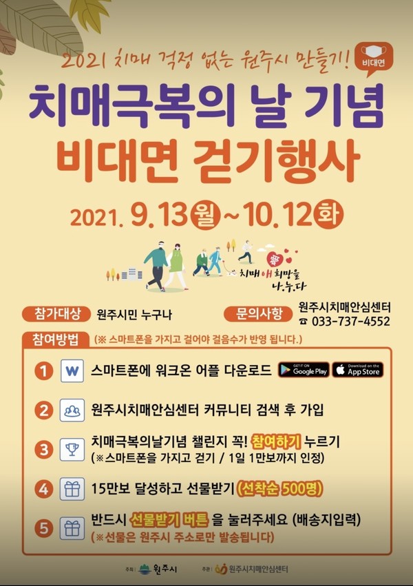 이번 행사는 코로나19 사회적 거리두기에 따라 모바일 걷기 플랫폼 ‘워크온(WalkON)’앱을 활용해 비대면으로 진행된다. 걷기에 관심 있는 원주시민이면 스마트폰에 모바일 걷기 플랫폼 ‘워크온’ 앱을 설치하고 원주시 공식 커뮤니티에 가입한 다음 ‘치매 걱정 없는 원주시 만들기! 치매 극복의 날 기념 비대면 걷기 행사’ 챌린지를 선택해 신청하면 누구나 참여할 수 있다.