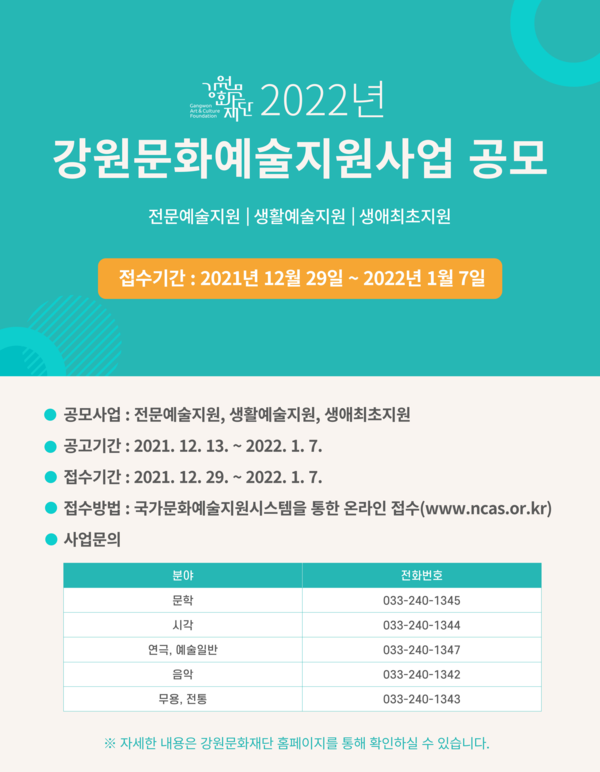 사업별 자세한 공모사항 안내를 위해 12월 16일 오후 2시 유튜브 채널(강원문화TV)에서 온라인으로 사업설명회를 진행하며, 공모 신청은 2021년 12월 29일부터 2022년 1월 7일까지 국가문화예술지원시스템(www.ncas.or.kr)을 통해서만 가능하다. 보다 자세한 사항은 강원문화재단 홈페이지(www.gwcf.or.kr) 사업공고에서 확인할 수 있다.