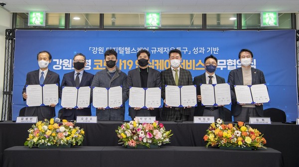 □ 강원도는 1월 26일(수) 원주시, 강원테크노파크, 원주 세인트병원, ㈜리얼타임메디체크, ㈜메쥬, ㈜오톰 등 6개 기관과 비대면 의료 서비스 기반‘강원도형 코로나19 안심케어 서비스’시행을 위한 업무협약(MOU)을 체결했다고 밝혔다.