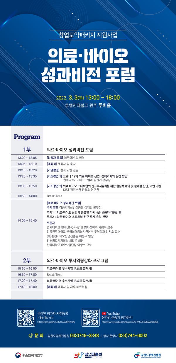 강원도경제진흥원(원장 홍경수)은 2022년 3월 3일 온·오프라인 동시에 진행되는 의료·바이오 성과비전 포럼’을 개최한다고 25일 밝혔다.