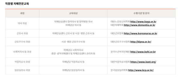 직종별 치매전문교육애 대한 상세일정은 교육 수행기관으로 문의