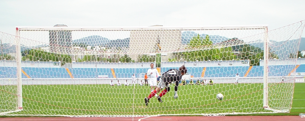 〈사진〉 승부차기 - 볼을 막기 위해 골키퍼가 몸을 던지고 있다