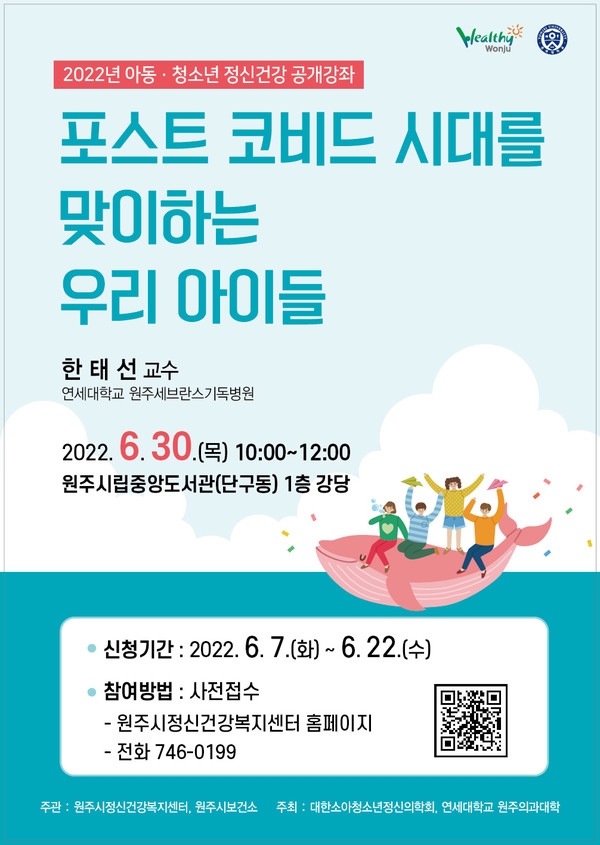 오는 6월 30일(목) 오전 10:00~12:00시에 원주시립중앙도서관(단구동) 1층 강당에서 " 포스트 코비드 시대를 맞이하는 우리 아이들'이라는 주제로 2022년도 아동청소년 정신건강 공개강좌가 열린다.