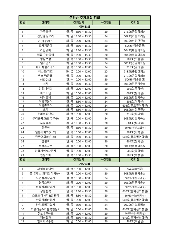 밸리댄스와 색소폰, 한글서예 등 29개 취미강좌, 과일플레이팅과 노인심리상담사, 양식조리기능사 등 13개 기술강좌 수강생을 추가 모집한다.