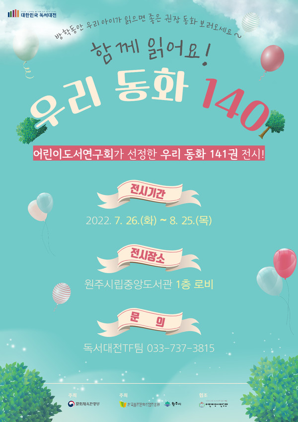 원주시립중앙도서관은 7월 26일부터 8월 25일까지 ‘함께 읽어요 우리 동화 140’ 전시를 운영한다고 밝혔다.