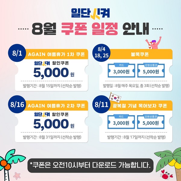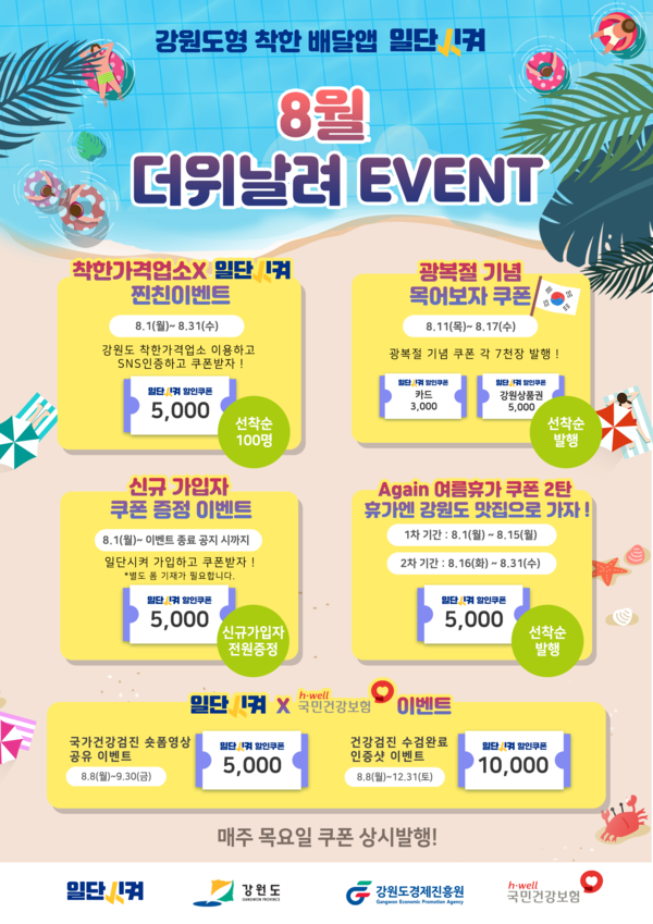 ③ 일단시켜 첫 가입 환영 쿠폰 이벤트 (계속) - 일단시켜 신규 회원으로 등록하면 매주 금요일 쿠폰(5천 원) 지급 ④ 일단시켜 정기 이벤트 지속 추진 (계속) - 8월 여름휴가 쿠폰(5천 원), 목요일 목어보자 쿠폰(3~5천원) 지급 ⑤ 강원도 쓰리콤보 공공앱 크라우드 펀딩 이벤트(7.12~8.11) - 3만원 펀딩 참여 → 일단시켜 2만 원 쿠폰, 강원더몰 3만 원 쿠폰 지급 |