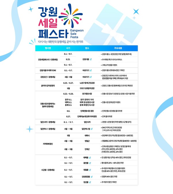 지난 7월에 이어 두 번째로 개최하는 이번 강원세일페스타는 ‘2022 대한민국 동행세일(중소벤처기업부 주최)’ 및 추석 할인기획전과 연계해서 ‘다시 사는 대한민국 동행세일, 같이 사는 한가위’라는 캐치프레이즈를 내걸고 진행된다.
