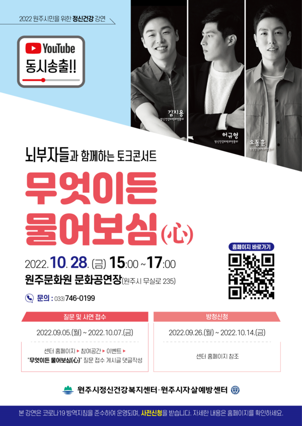 원주시정신건강복지센터(센터장 민성호)는 오는 10월 28일 원주문화원 문화공연장에서 유튜버 뇌부자들과 함께하는 정신건강 토크콘서트 ‘무엇이든 물어보심(心)’을 개최한다.