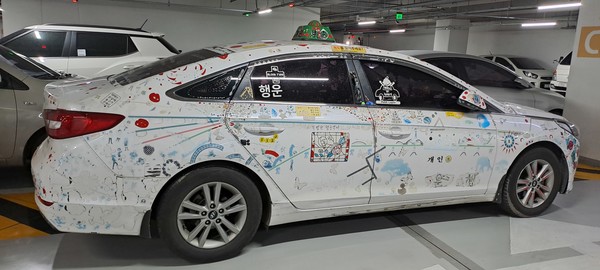 A) 무엇보다 나의 택시에서 함께 놀아 준 외손자! 외할아버지의 마음속에 감춰진 두 손을 번쩍 들어 올려준 외손자가 고맙지요. 고사리 손으로 할아버지하고 차 닦고 택시 유리창에 공룡 스티커 붙이며 좋아하던 외손자 덕분에 제 차가 행운택시로 탄생하게 된 것이지요. 지금은 차 외부에 나비를 비롯한 큰 스티커를 붙여 즐거운 뽀로로 동화나라 택시가 됐답니다. 힘든 일을 겪는 모든 사람들이 저의 행운택시를 타고 많은 행운을 받아 가시기를 바랍니다. 늘 행복하고 즐거운 생각을 하면 그렇게 즐겁고 행복한 나날들이 저절로 온답니다. 힘들고 지치더라도 용기를 가지고 행복하게 사시기를 바라는 거, 그게 제가 바라는 바입니다.