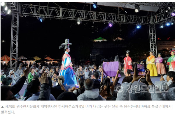 사전 면접을 통해 선발된 시민 모델 50명이 비가 내리는 궂은 날씨 속 특설무대에 설치된 런웨이에 올라 한지 직물 한복, 한지로 만든 고구려 벽화의상을 선보여 관객들의 박수를 받았다. 벨라무지카 어린이합창단은 축제 25주년을 맞아 한지의 노래 ‘내 친구 한지’를 개막식 무대에서 선보였다.
