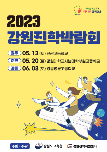 강원도교육청(교육감 신경호)은 13일(토) 원주 진광고등학교, 20일(토) 춘천 강원대학교사범대학부설고등학교, 6월 3일(토) 강릉명륜고등학교에서 오후 12시 30분부터 5시 30분까지 2023 강원진학박람회를 개최한다.