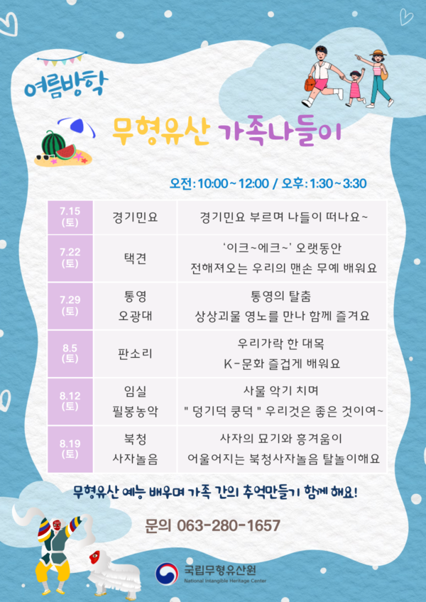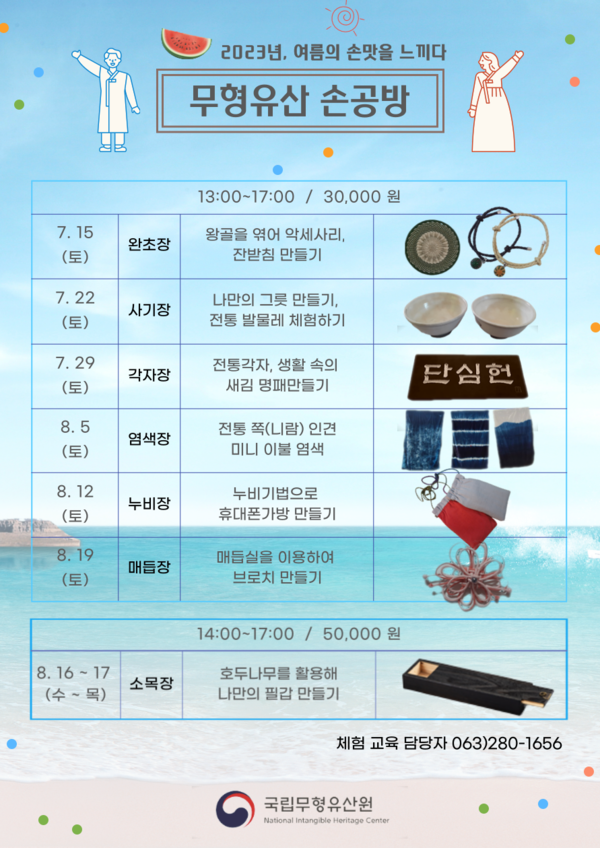 문화재청 국립무형유산원(원장 안형순)은 여름 방학 및 하계 휴가기간을 맞아 7월 15일부터 8월 19일까지 매주 토요일 국립무형유산원(전북 전주시) 전승마루에서 가족 및 일반인 대상 무형유산 주말 체험 프로그램을 진행한다. 프로그램은 가족단위로 무형유산 예능종목을 체험하는 「무형유산 가족나들이」와 성인 대상의 공예종목 체험 프로그램인 「무형유산 손공방」이다.