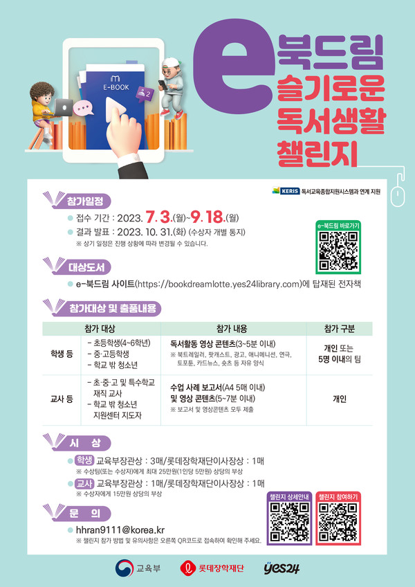 교육부(부총리 겸 교육부장관 이주호), 롯데장학재단(이사장 천영우), 예스24(대표이사 김석환, 최세라)는 아이들이 비용 걱정 없이 마음껏 책을 읽을 수 있도록 전자책 무료구독 서비스(이하 ‘이(e)-북드림’)를 7월 1일(토)부터 대폭 확대한다.