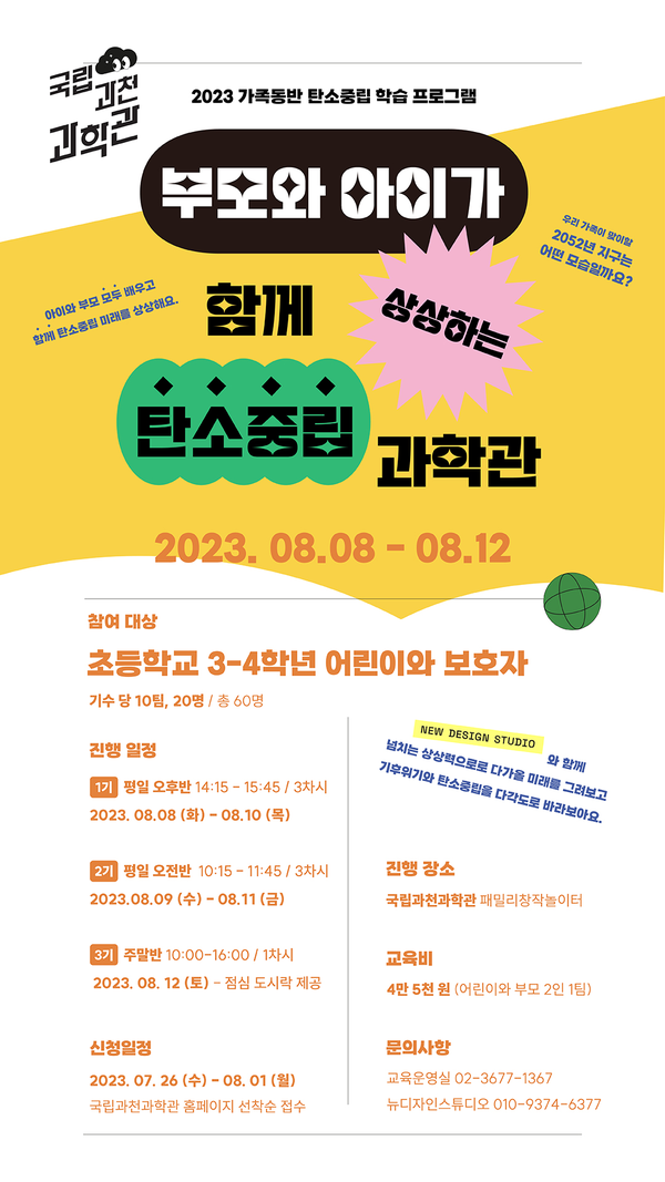 한편, 특별교육과정과 더불어 8월 8일부터 12일까지 가족 동반 수업인 ‘부모와 아이가 함께 상상하는 탄소중립 과학관’프로그램을 울산과학기술원(UNIST) 뉴디자인스튜디오와 공동으로 운영한다. 총 3차시에 걸쳐 2052년 지구의 모습을 그려보며 기후위기와 탄소중립에 대해 생각해 볼 수 있다.