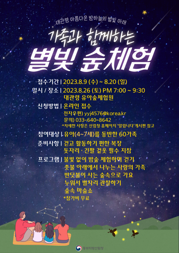 동부지방산림청(청장 최수천)은 오는 8월 26일 평창군 소재 대관령 유아숲체험원에서 공감숲연구소가 주관하는 ‘가족과 함께하는 별빛숲체험’ 행사를 개최한다고 10일 밝혔다.