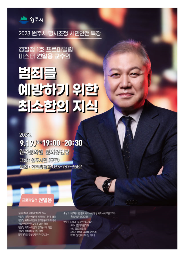 원주시는 오는 19일 오후 7시 원주문화원 문화공연장에서 제1호 프로파일러 권일용 교수를 초청하여 시민안전 특강을 개최한다.