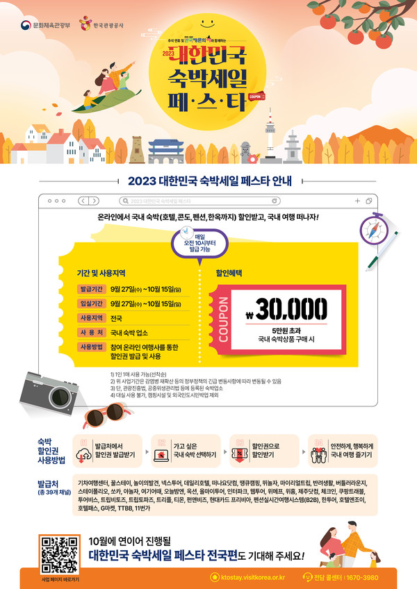 9. 27.~10. 15. 숙박 할인권 30만 장 배포, 1인 1매 선착순 제공