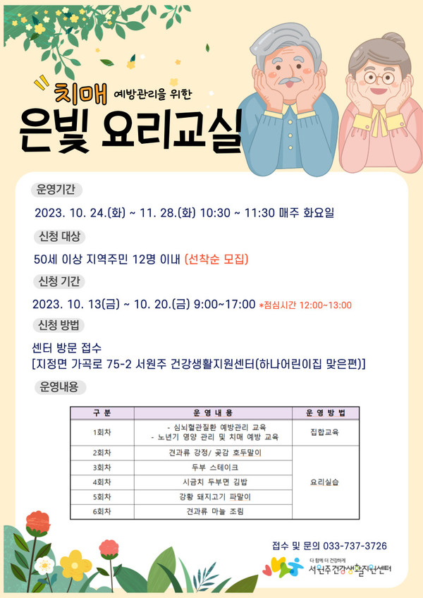 기업도시 내 서원주 건강생활지원센터는 10월 24일부터 지역주민의 치매 예방관리를 위한 2기‘은빛 요리교실’를 운영한다.