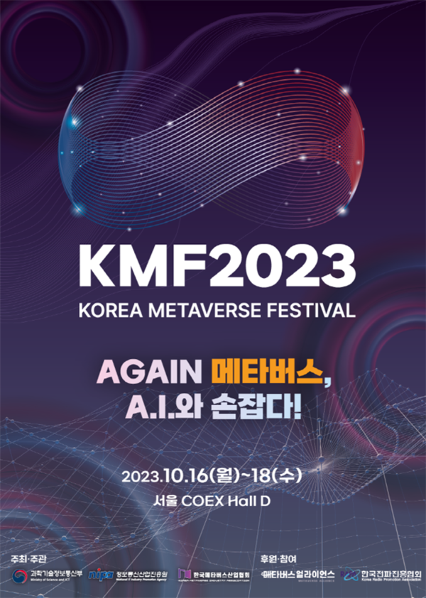 과학기술정보통신부(장관 이종호, 이하 ‘과기정통부’)는 메타버스 산업 분야 국내 최대 종합 행사인 「‘코리아 메타버스 페스티벌 2023’(이하 ‘KMF 2023’)」을 2023년 10월 16일(월)부터 18일(수)까지 3일간, 서울 코엑스 D홀에서 개최한다고 밝혔다.