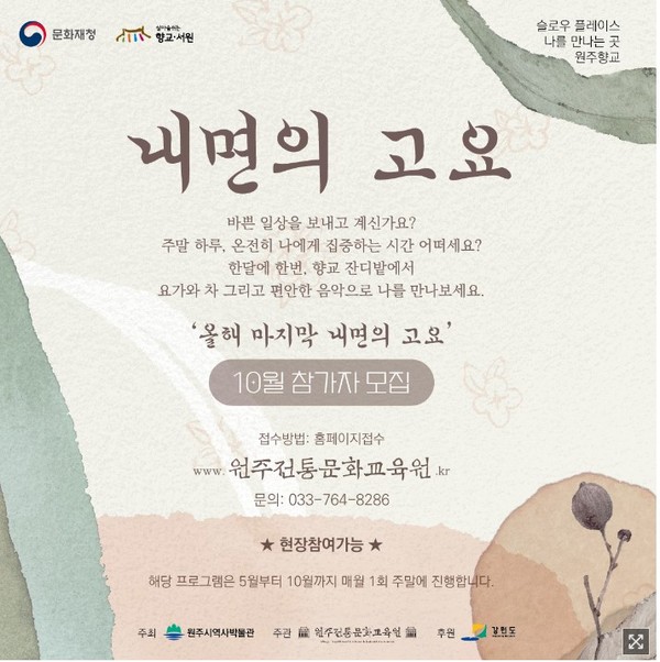 원주전통문화교육원에서 내면의고요 참여자를 모집합니다. 키워드 #원주 #원주시역사박물관 #원주전통문화교육원 오선민 기자 redsocks1202@hanmail.net 다른기사 보기 저작권자 © 투데이피플 무단전재 및 재배포 금지 당신만 안 본 뉴스 옥천 팔음산마을- 자연 속 '녹색 치유'와 옥천 명소 탐방의 거점 어디까지가 청렴의 대상인가? — 감사의 계절, 신뢰를 다시 묻는다 옥천 1경 둔주봉, 금강이 빚어낸 기적을 마주하다 AI 교육 전문가, 현원종 강사를 만나다 [강사 인터뷰] KTR-이미루 강사 협업 "AI 인플루언서 마케팅" 교육 개설. 광고비 50분의 1 절감 효과 [신규 기업강의 소개] [단독] 이미루 강사, "기업교육, 변화는 선택이지만 '진화'는 생존이다" 강조 [이미루의 경제이야기 픽트렌드] '심리적 결핍'이 낳은 소비 트렌드: 2026년, 소비자는 불안한 관계 속에 '확실한 소속감'을 구매한다 옥천 팔음산마을- 자연 속 '녹색 치유'와 옥천 명소 탐방의 거점 댓글삭제 삭제한 댓글은 다시 복구할 수 없습니다. 그래도 삭제하시겠습니까? 비밀번호 닫기 기사 댓글 0 댓글 접기 로그인 후 이용 가능합니다. 댓글 내용입력 비회원 로그인 이름 비밀번호 댓글 내용입력 댓글쓰기 계정을 선택하시면 로그인·계정인증을 통해 댓글을 남기실 수 있습니다. 회원 로그인 비회원 글쓰기 이름 비밀번호 자동등록방지 로그인 옵션 창닫기