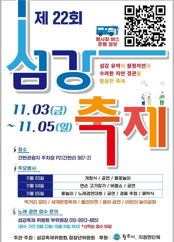 ‘제22회 섬강 축제’가 11월 3일부터 5일까지 3일간 간현관광지 제2주차장(간현리 887-2)에서 열린다.