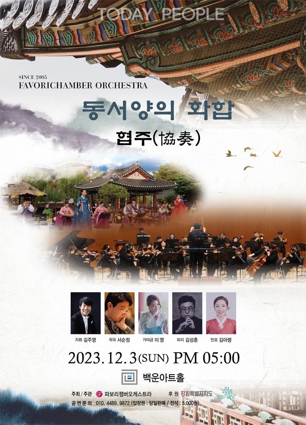 이번 연주회는 원주시의 대표 연주단체인 파보리 챔버 오케스트라와 국악의 협주로 가야금 연주자 이영,국악 작곡자 서순정, 민요 김아령, 피리 김성훈이 함께한다.