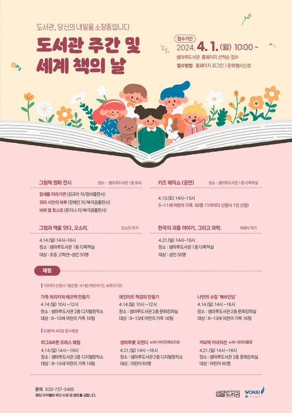 강좌 접수 및 자세한 내용은 샘마루도서관 누리집(https://lib.wonju.go.kr/sm/index.do)에서 확인하거나 미리내도서관 샘마루도서관팀(☎033-737-5495)으로 문의하면 된다.