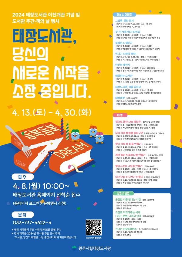 태장도서관(관장 백연순)은 오는 4월 13일부터 30일까지 도서관 이전개관 기념 및 제60회 도서관 주간·세계 책의 날을 맞이하여 다양한 문화 프로그램을 운영한다.