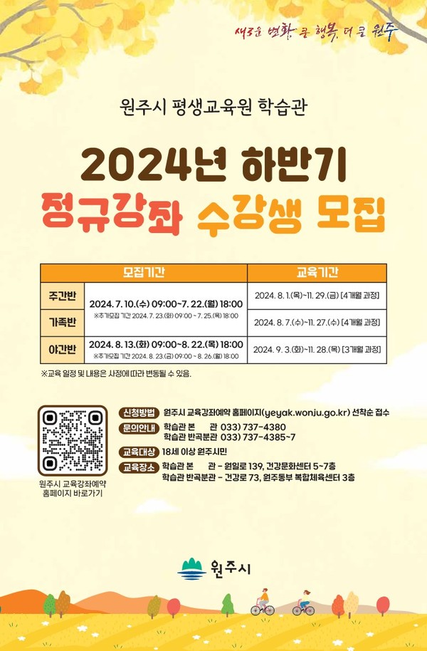 원주시 평생교육원 학습관(관장 전제천)은 본관(원일로 139)과 반곡분관(건강로 73)의 ‘2024년 하반기 학습관 정규강좌’ 수강생을 모집한다.