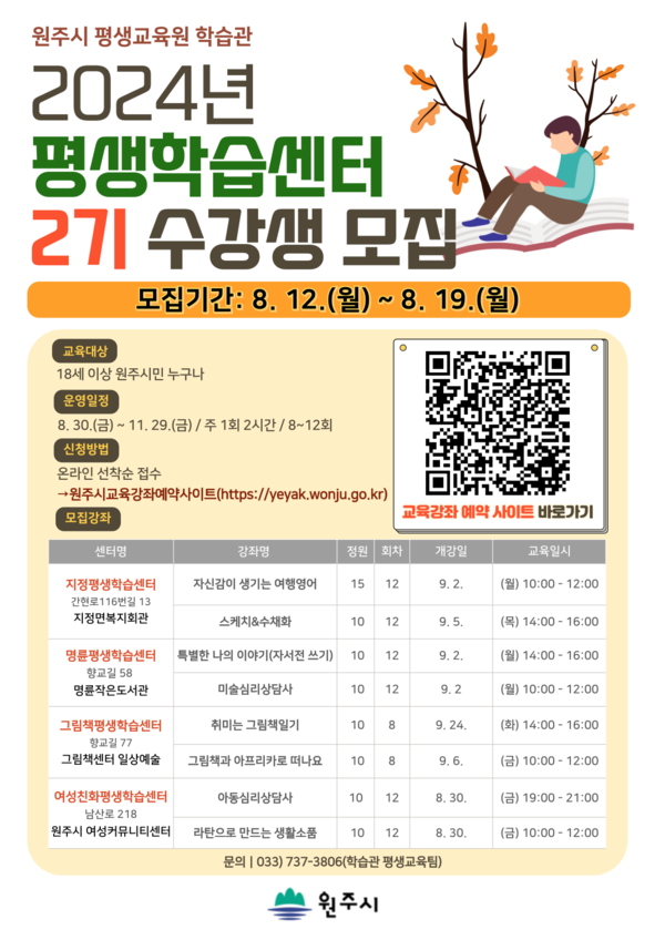 원주시 평생교육원 학습관은 2024년 평생학습센터 2기 수강생을 모집한다.