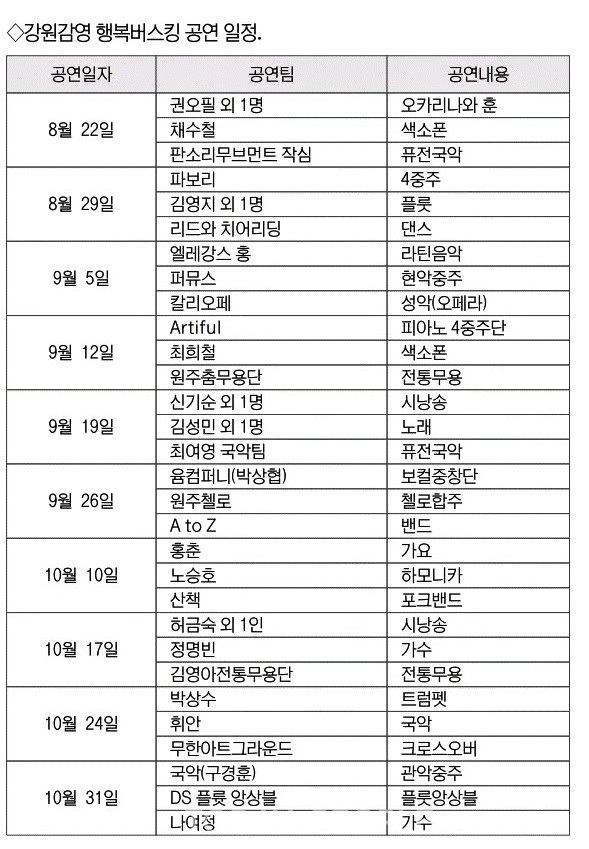 이번 행복버스킹엔 ▷클라리넷 ▷라틴음악 ▷댄스 ▷피아노 4중주단 ▷전통무용 ▷성악 ▷밴드 등 보다 다양한 장르로 공연이 준비됐다. (자세한 공연 일정은 하단 표 참고.)