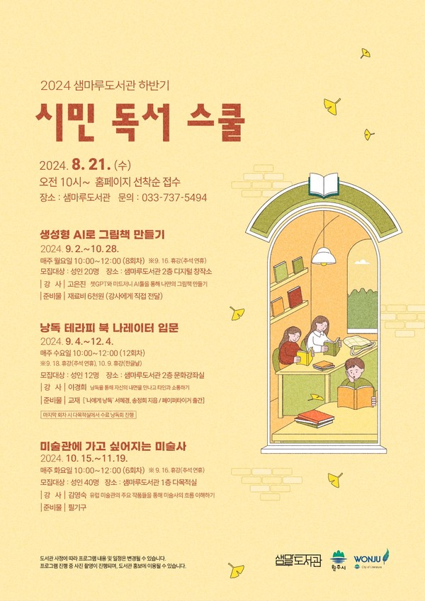 원주시 샘마루도서관은 오는 9월부터 원주 서부권 주민들의 문화적 참여 독려와 관내 독서 활동 활성화를 위해 하반기 ‘시민 독서 스쿨’을 운영한다.