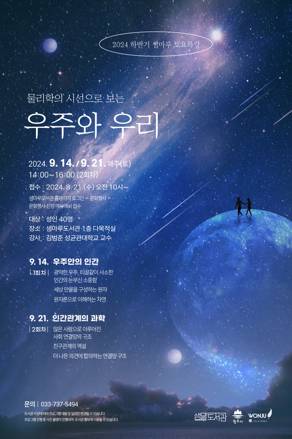 원주시 샘마루도서관은 ‘과학 인문학, 물리학의 시선으로 보는 우주와 우리’라는 주제로 2024년 하반기 토요특강 프로그램을 운영한다.