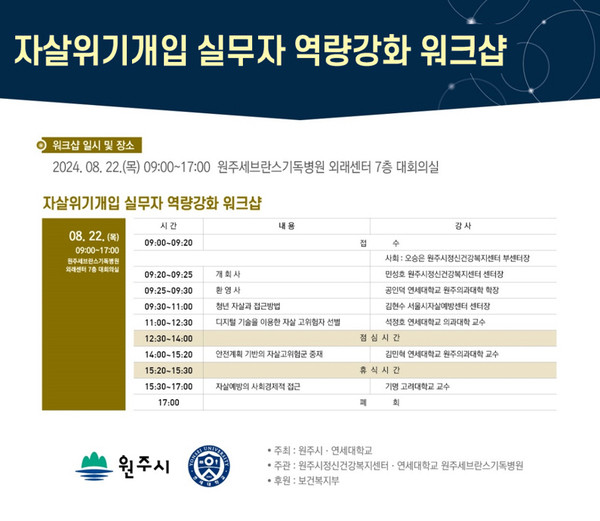 자세한 사항은 원주시자살예방센터(☎033-746-0198)로 문의하면 된다.