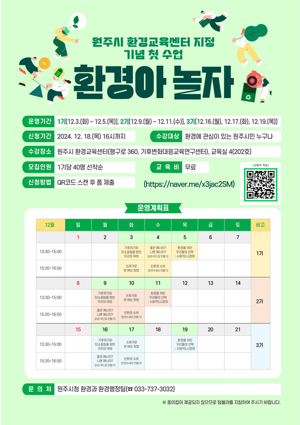 원주시 환경교육센터는 센터 지정을 기념해 12월 3일(화)부터 19일(목)까지 환경교육 프로그램 ‘환경아 놀자’를 운영한다.