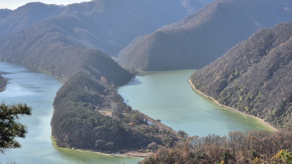 단풍이 비탈을 따라 붉게 물들고, 그 사이를 흐르는 금강의 은빛 물결이 한반도 지형을 더욱 또렷하게 드러낸다.